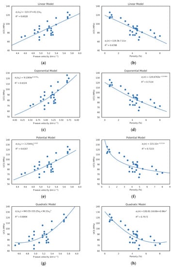 Relationship between UCS and independent variables: P-wave velocity and porosity for analytical models (a,b) linear, (c,d) exponential, (e,f) potential and (g,h) quadratic.