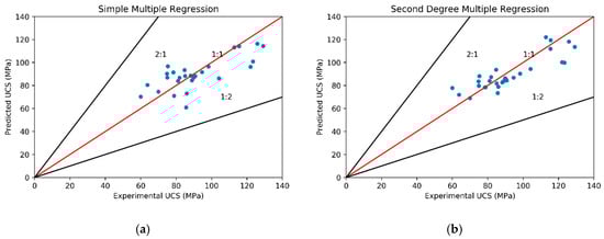 Predicted UCS vs. experimentally determined UCS for simple multiple regression (a) (Equation (22)) and second degree multiple regression (b) (Equation (23)).