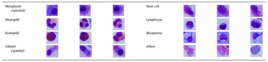 Different types of cells are considered in the diagnosis of nasal diseases. Considering the diversity of the cells present in the nasal mucosa, it is, therefore, appropriate to draw up a classification of the different cytotypes present both in a healthy individual and in an individual with a pathology. The nasal mucosa cells belonging to a cytotype show some elements with high similarity; however, each cytotype appears quite different from all the others. These features allow their automatic classification [23]. A brief description of the appearance of each of the cells located in the nasal mucosa is reported below, and corresponding sample images are shown in Figure 1: