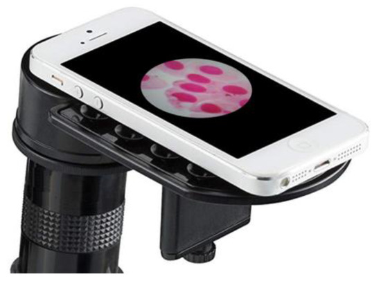 The images of the smears used in this experimentation, supplied by the Policlinico di Bari, have been acquired with a Samsung Galaxy S6 Edge smartphone with a 16 Mpixel digital rear camera, with a photo resolution of 5312 × 2988 pixels and an aperture of F / 1.9. A specific smartphone adapter was also used, as shown in Figure 2. The system proposed here is based on image enhancement, segmentation, and morphological processing [43], which allows for the extraction of the cells present in the photo acquired by the smartphone camera and will be dealt with in this paper shortly.