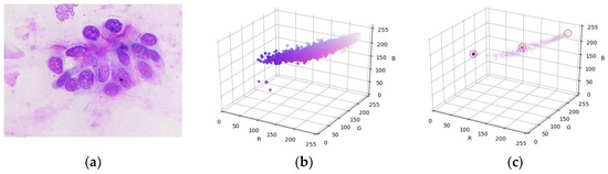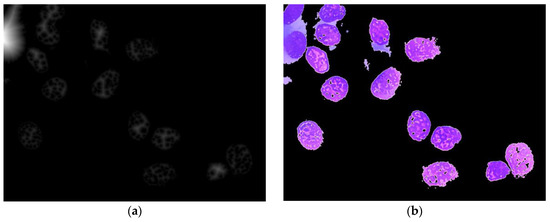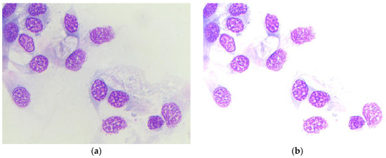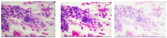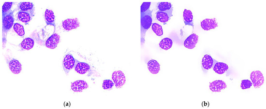 Image brightness is “gamma-corrected”, further increasing image contrast by making the color shades of the nuclei more saturated; moreover, the Mean Shift algorithm is applied to make the coloring of the cell nuclei more homogeneous, as shown in Figure 6.
