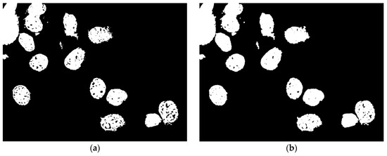 After grayscale conversion, segmentation is made with automatic threshold to separate cells, as shown in Figure 7. To improve image quality and correct any defects due to Otsu’s binarization, such as holes in cell nuclei, the process benefits from the use of aperture in combination with dilation.