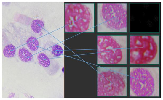 The final step of the proposed system carries on ROI detection basing on their area, in order to reduce non-cell regions that can be improperly highlighted. In fact, only regions that have an area included in a specific range (a1, a2) are extracted; range values depend on the image resolution. As explained above, we resized the original images to 1024 × 768 pixels and then determined the range experimentally, setting a1 = 80 and a2 = 250. Examples of the cropped cells after applying this operation are given in Figure 9. Figure 10 shows images of the designed app, and in Figure 11 the software pipeline related to cell extraction is reported.