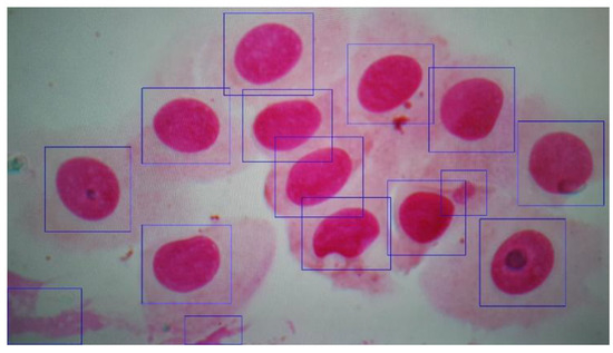 In Figure 12 a qualitative example of the working system for one of the 75 images is reported. The result in terms of the detected cells is shown with a blue bounding box around the segmented objects. The performance of this system is reported in Table 1—all cells and non-cells on the 75 slides were also manually labeled by domain experts, to obtain the ground truth.