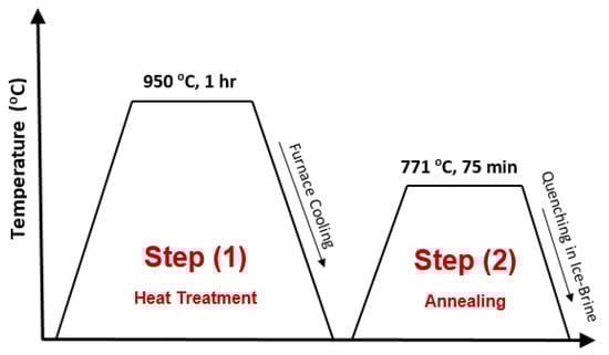 A DP structure was produced from low-carbon steel via two heat treatment steps, as shown in Figure 1. Step 1 was a normalizing process for 60 min at 950 °C in a tube furnace, and Step 2 was an annealing process for 75 min at 770 °C before quenching in ice-brine water at an average temperature of −10 °C.