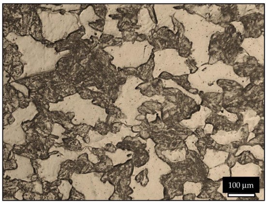 Figure 3 shows the DP rebar microstructure. It also comprised two phases, a soft ferrite phase (white regions) and a hard martensite phase (dark regions). The grains looked larger compared to rebar and were oriented in a random direction. We determined the relative amount of ferrite and martensite via image processing using Leica LS image analyzer software. The martensite volume fraction was almost equal to the area fraction because the sample was thin (900 mm), which came to ~22% in DP rebar.