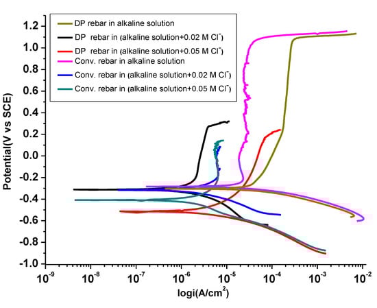 Figure 4 shows potentiodynamic polarization curves for SCPS with and without NaCl. As explained by Pourbaix diagram [34], DP rebar shows spontaneous passivity in the presence of an alkaline medium compared to conventional rebar. High Cl− ion concentrations may affect the passive state [35].
