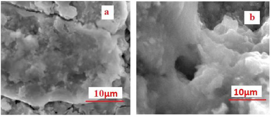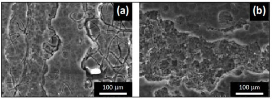 Figure 5a,b shows the surface morphology of conventional rebar and DP rebar after oxide or passive layer breakdown during anodic polarization in SCPS containing NaCl. The surface morphologies showing pitting on the surface seemed different, although the electrolyte composition used was the same. We observed cracks beside the pits formed by corrosion. In addition, we observed cracks initiating oxide or passive layer breakthrough at other places. Hydrogen absorption at the metal surface might be possible. Water molecules or hydrogen ions might get reduced at the metal surface and seep through the broken oxide or passive layer, facilitating hydrogen absorption, which might form hydrides [34,38]. This generates tensile stress, leading to crack initiation in the oxide or passive layer. Cracking inhibits repassivation and promotes active dissolution. Anodic dissolution and crack propagation are responsible for the growth of pits in the vertical (depth) and lateral directions, respectively.