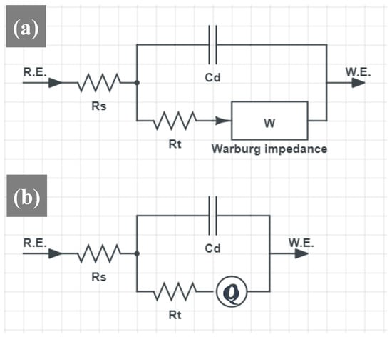 EIS results at 0 V (SCE) showed that diffusion controls oxide or passive layer growth in conventional rebar and DP rebar. Figure 6 shows the equivalent circuit, where Q is the constant phase element CPE, RS the solution resistance, W the Warburg impedance, and Rt the layer transition resistance. According to diffusion boundary conditions, there are three types of diffusion impedances for plane electrodes [39,40].