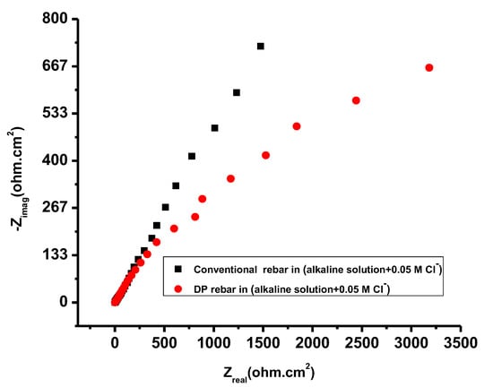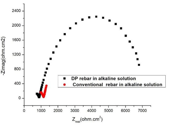 All parameters of potentiodynamic polarization and EIS results in an alkaline solution with and without different Cl− ion concentrations are listed in Table 2. The polarization resistance (Rt) for the DP rebar oxide or passive layer was larger compared to conventional rebar. This result also verified that the passive current density of DP rebar is lower compared to conventional rebar as concluded from Figure 8 and Figure 9.