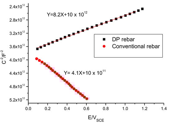 The oxide or passive layer formed on metals significantly affects corrosion resistance [41]. The layer usually exhibits semiconducting properties [42,43]. The most common technique for investigating the electronic properties of an oxide or passive layer is Mott–Schottky plot measurement, which characterizes the oxide or passive layer generated on metal surfaces. In this study, we used electrochemical capacitance measurements to characterize the electron properties of the oxide or passive layer formed on conventional rebar and DP rebar.