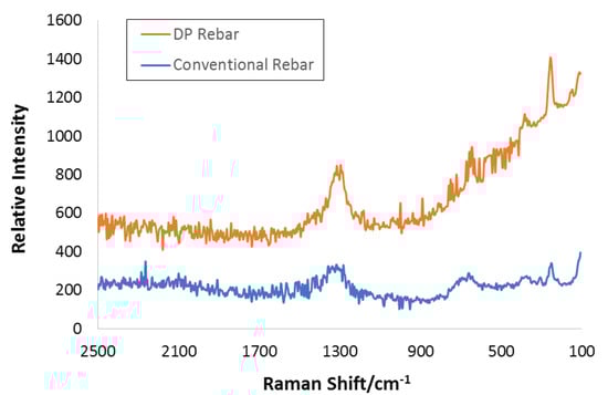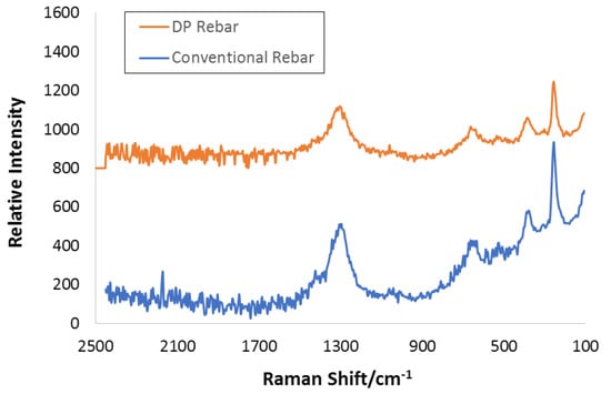 For conventional rebar, the Fe2O3 Raman spectrum became more intense, displaying acceleration or oxide or passive film dissolution because of the chloride effect, confirmed by electrochemical studies. The low-intensity peaks at 722 and 282 cm−1 showed γ-Fe2O3 and α-Fe2O3, respectively (Figure 12) [48,49]. Subsequently, γ-Fe2O3 and α-Fe2O3 could be measured, compared to chloride-free SCPS, and were identified to be constituting the upper surface layer of steel [50,51].