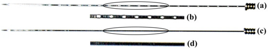 The project was approved by the Local Ethics Committee (Central Denmark region). The study was carried out at the Department of Dentistry, Aarhus University, Denmark. The participants were randomly assigned to receive the active (Nano-SS needle Figure 1a,b) or the inactive (sham needle Figure 1c,d) acupuncture in the first session. After approximately 10 days, each subject received the intervention, which was the opposite of that received in the first session. Each acupuncture session lasted up to 30 min, including 20 min of acupuncture treatment with three acupuncture needle stimulations and repeated PPT measurements at three sites: (1) the masseter muscle on the same side as the dominant hand, (2) the masseter muscle on the non-dominant hand side, and (3) the thenar muscle of the dominant hand at four time points: (a) before acupuncture, (b) immediately after needle insertion and stimulation, (c) after 10 min of acupuncture and repeated stimulation, and (d) after a third stimulation and subsequent removal of the acupuncture needles. The PPT test sites were chosen in order to demonstrate local as well as generalized effects.