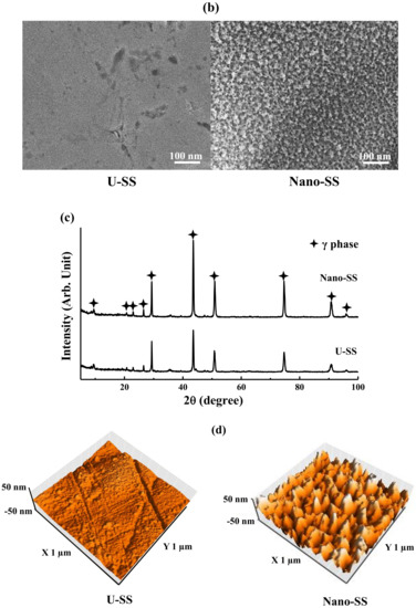 Atomic force microscopy (AFM; Mobile S, Nanosurf Inc., Liestal, Switzerland) and scanning electron microscopy (SEM; JSM-6500F, JEOL Inc., Tokyo, Japan) were performed to analyze the surface morphology and roughness of the Nano-SS sample (disc-type). Phase identification and crystallinity analysis were carried out in an X-ray diffractometer (XRD; Rigaku 2200, Rigaku Inc., Tokyo, Japan), with CuKα1 radiation operated at 50 kV and 250 mA. Wettability examination was performed using the sessile drop method by a GBX DGDDI contact angle goniometer (Drôme, France) using liquid deionized water [33]. Contact angle measurements were performed using at least five drops for each sample in order to reduce variation.