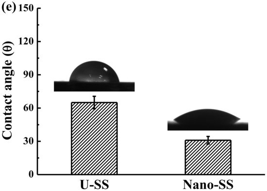 Figure 3a shows the SEM image of a Nano-SS needle sample. Laser modification resulted in a wave like structure on the surface. A higher magnification SEM image of the white circle area in the Nano-SS sample shows the presence of nano-porous structures on the surface of the Nano-SS sample (Figure 3b). Figure 3c shows the XRD patterns from the U-SS and Nano-SS samples. All the peaks were analyzed using the database from the Joint Committee on Powder Diffraction Standards. Only typical austenite phase (γ) peaks were detected in the U-SS and Nano-SS samples. The crystalline structure of the γ phase belongs to face centered cubic structure. No other precipitates or intermetallic compounds could be found on the surface of the Nano-SS sample. According to the AFM observation, the surface roughness (represented as root mean square) of the nano-porous structure was about 18.6 nm (Figure 3d). The contact angle of the U-SS and the Nano-SS samples is presented in Figure 3e. The Nano-SS needle sample exhibited a more hydrophilic surface (~31°) than the U-SS sample (~65°) [37]. Thus, a hydrophilic wave like surface layer with nano-porous structure was formed on the surface of the Nano-SS sample.