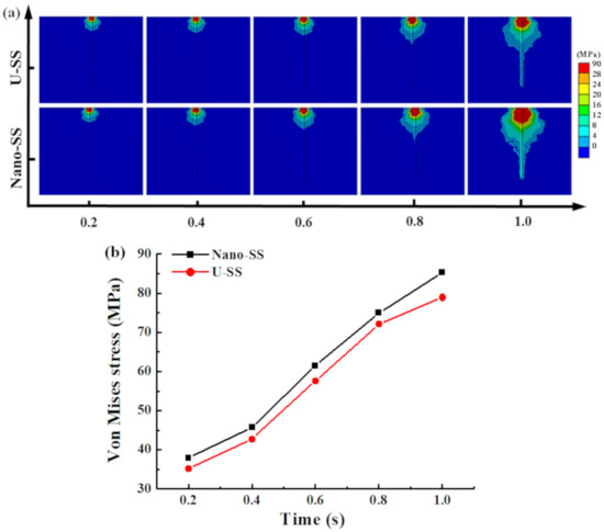 Figure 4a shows the stress distribution for the Nano-SS and U-SS models on the skin at 1 s. The maximum stress varied from 35.2 MPa to 85.3 MPa in all models, as shown in Figure 4b. In the Nano-SS group, the stress (85.3 MPa) was larger than the maximum stress of 78.9 MPa in the U-SS group at 1 s. The stress on the skin while using treated needles was larger than that exerted by the needles without surface treatment. However, the stress patterns in both models were similar to each other. Analysis of the present study indicated that stresses were induced by the needle.