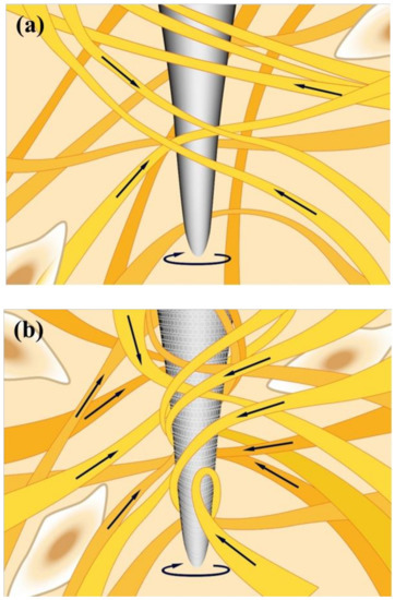 The active needles induced significantly more frequent and intense sensations than the sham needles. This can probably be attributed to the depth of needle insertion, but also partly to the increased surface area of the Nano-SS needle, which provides more space for tissue attachments leading to greater stimulation. As compared to smooth surfaces (U-SS needle), the textured needle shaft surfaces of the Nano-SS needle present more surface area for interaction with and stimulation of the tissues. It can be expected that the textured surface has a positive influence on connective tissue grasping and winding, which may result in a better stimulation result (Figure 5) [16,17,44,45,46]. The contact area of the needle has a lot to do with the stimulation effect of the acupuncture manipulation techniques. The technique of rotational manipulation increases needle pull out forces, when acupuncture needles are inserted into the connective tissue layer (unidirectional and bidirectional). The winding of connective tissue because of the acupuncture manipulation may transduce a series of mechanical signals and stimulate endocrine physiological events [20,47,48]. Finite element method detected hard stimulation in the group receiving acupuncture with surface treated needles. The discontinuous structure induced lots of stress confusing to stimulate the neural pain sensation to promote the clinical treatment effect [49,50].