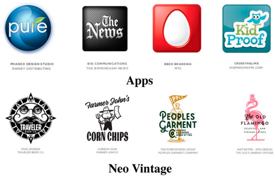 Today, the logos produced all over the world often reflect the popular social phenomena of the era [4,5]. For example, as shown in the top row of Figure 1, logos inspired by smartphone app icons appeared as a trend in the early 2010s, reflecting the fact that many people were using smartphone apps owing to the spread of smartphones. As shown in the bottom row of Figure 1, in 2018, there was a trend in which retro-styled fashion became popular again and illustrations inspired by hand-drawn images in the 1960s and 1970s were reinterpreted in the form of logos.