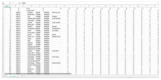 Figure 5 shows an example of quantification of the logo trend characteristics (dataset download URL: https://bit.ly/3fwRILh). Column D in the figure is the trend name of the logo, and each trend is quantified according to criteria such as the concept element, visual element, correlation element, and the interrelationships of forms. Figure 6 is an example of analyzing each trend using the analysis criteria of Table 1. Figure 6 shows which design shape elements should be highlighted in order to form each logo trend.