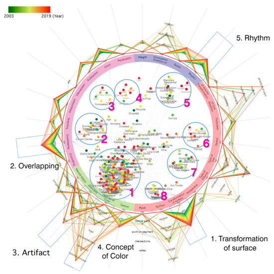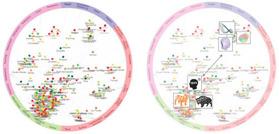 The color of the circular parallel coordinates indicates the line pattern of a more recent year as it moves from the green to a red line pattern. Each node in the RadViz plot represents one logo trend. There are also keywords representing the shape elements on the four colored ring-shaped bands around the circle. Each point where this keyword appears becomes a dimensional anchor that pulls the nodes. Therefore, the logo nodes are powered by the dimensional anchors indicated by the keyword, and they form a scatter plot. The nodes in close proximity to each other indicate trends with similar design shape elements.