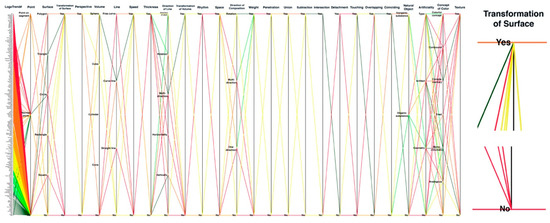 However, as shown on the left side of Figure 9, it was pointed out that viewing the patterns of the entire line on the web may be difficult if the parallel coordinates layout having linear structure is applied. This is because of the large number of variables in the data and the close arrangement of the axis. Furthermore, given that many line graphs overlap, it has been indicated that quickly determining the number of logo trend models that are included at a certain point for each shape element may be difficult. More specifically, when looking at the right side of Figure 9, which is an enlarged portion of the parallel coordinates, numerous line graphs overlap in the ‘Yes and No’ point. In such a case, it is difficult to understand immediately how many logo trend models are located at each point.