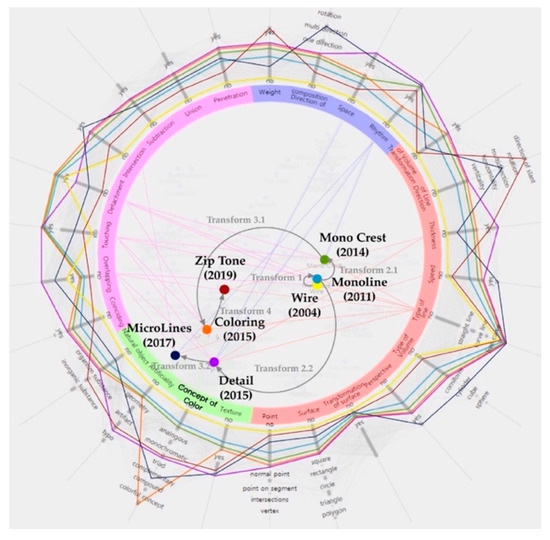 RadViz and circle parallel coordinates showing how the 2004 logo trend “Wire” was transformed into a new trend over time. Adapted from Reference [10]; 2015.