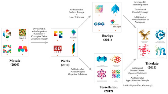 First, the patterns of evolution were observed when we analyzed the visualization of logo trends present in a specific cluster. Figure 14 shows how the logo trend “Mosaic” in 2009 evolved over time into a new trend. The trends that belong to the “Mosaic” trend evolution fall under Cluster 1 in RadViz as these trends feature combinations of objects having different colors. In the “Mosaic” trend, the shape element characteristics are unions of surfaces having colorful concepts.