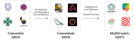 Figure 15 shows how the logo trend “Concentric”, created in 2011, evolved over time into a new trend. The trends belonging to the evolution of “Concentric” fall under Cluster 5 in RadViz as they share elements that commonly show rhythm. The “Concentric” trend has the characteristic of conveying a feeling of rhythm in a process where numerous lines are arranged into a repetitive pattern. After 2011, this trend received attention again in 2015 in relation with a trend called “Concentrak”, with similar shape elements. Then, the trend further evolved to “MultiCentric” in 2017. As shown from this trend evolution, the line thickness changed and the monochromatic color concept, which was maintained in the previous trends, evolved to a colorful concept in the latest trend.
