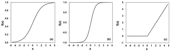 Activation functions in neural networks; (a) sigmoid, (b) hyperbolic tangent, and (c) rectified linear unit (ReLU).