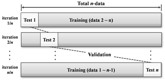 The performance of the proposed model can be confirmed through the estimation error of the model. If the MLR is established using the entire data, the performance for prediction may be relatively favorable, but predicting the new data may be less accurate. Therefore, the independent data validation must be conducted to establish a robust prediction model, and leave-one-out cross-validation is a suitable technique for evaluating the error of a given model by sequentially excluding samples in the dataset used to derive the model to produce greater reliability in the estimate [31]. Leave-one-out cross-validation is a technique for generating a prediction formula through all the data except for one sample, as shown in Figure 4, and a prediction is made for that sample.