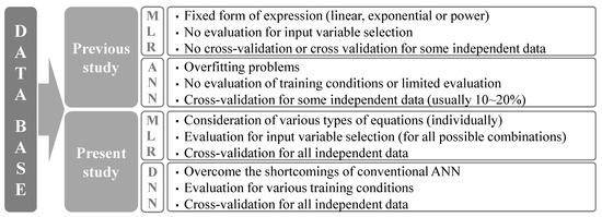 Previously, several studies have been conducted for predicting bearing capacity using MLR or AI. Although the same data set is used, the performance of the model may differ depending on the modeling technique. This study has some differences in modeling approaches from previous studies in order to improve the accuracy and robustness of the prediction model, and they are depicted in Figure 5.