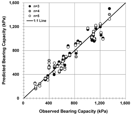 The numbers of input variables in the MLR were set to three, four, and five to find an efficient prediction equation, and the combinations of input variables were generated in accordance with the following number of input variables: 5984 (34C3), 46,376 (34C4), and 278,256 (34C5). Then, the leave-one-out cross-validation was performed for all combinations of input values to evaluate the prediction error. From the cross-validation results, the top three input variable combinations with the smallest mean absolute error (MAE) were selected in accordance with the number of input variables and are summarized in Table 3. Figure 6 presents a comparison of the observed and the predicted ultimate capacity for the best models in accordance with the number of input variables.