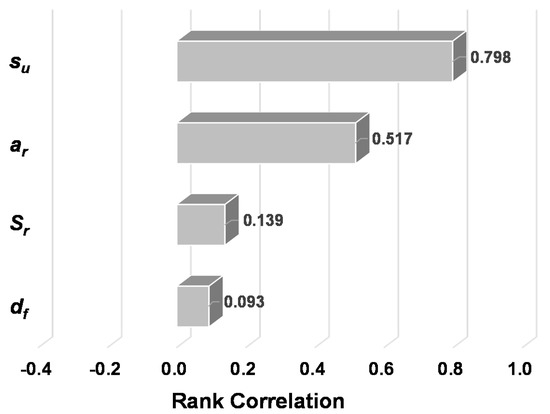 Sensitivity analysis was performed to evaluate the influence of each input variable on the bearing capacity prediction. There are generally two types of sensitivity analysis: global sensitivity analysis and local sensitivity analysis, and the global sensitivity analysis was performed through Monte Carlo simulations because this helps gain an overall vision of the system, which is especially useful for distinguishing a significant parameter from insignificant input parameters [38]. The range of each variable was estimated through the database in Table 1; su ranged from 12 to 100 kPa, ar ranged from 0.16 to 1.22, df ranged from 0 to 0.61 m, and Sr ranged from 2.0 to 26.3, and their distributions were assumed to be uniform. Although Sr is calculated as the ratio of Lp and dp, Sr was directly used in the sensitivity analysis because if Lp and dp are used for Sr, the range of Sr is overestimated in comparison with the actual range. From the simulation results, Spearman rank correlations were estimated, and their tornado diagram is shown in Figure 8.