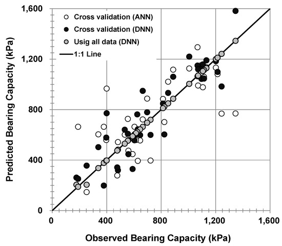 The results of the analysis indicated that a trained model with two hidden layers with a node of 10, batch size of 20, drop rate of 0, and epoch of 2000 provides the most accurate result. Therefore, the final deep learning model was established using all data under the above-mentioned learning conditions. The comparisons of the observed and the predicted ultimate bearing capacity for the cross-validation and all data in the DNN considering the optimal structure are shown in Figure 11.