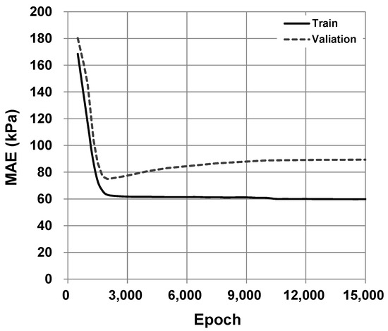 For the leave-one-out cross-validation, 36 load test data were used for training, and the excluded 1 load test datum was used for verification. This procedure was performed on all 37 data, and the prediction performance was evaluated through the average MAE. Figure 10 displays the change in MAE according to the number of epochs for the training and validation of the data.
