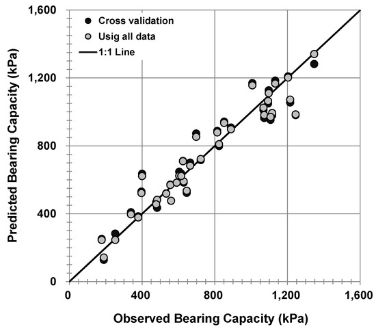 Comparison of predicted and observed ultimate bearing capacity by cross-validation.