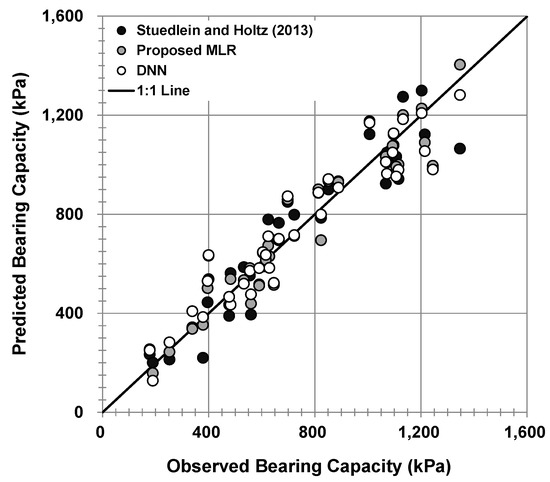 Therefore, the ultimate bearing capacity could be predicted effectively with only four parameters. Moreover, it could improve the prediction accuracy and reduce the predictive variability in comparison with the existing MLR equation. The DNN was also applicable for the ultimate bearing capacity prediction by selecting the optimal structure considering the cross-validation. However, the performance was inferior to the proposed MLR, and model-updating might be a time-consuming task because it requires selecting a new optimal structure. By contrast, the MLR equation could easily improve by updating the coefficients considering the new data.
