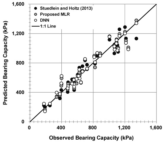 In the leave-one-out cross-validation, the MLR equation, which consists of the variables proposed by [18] showed the highest MAE of 89.7 kPa and bias of 1.023. The DNN model showed a favorable performance for new data with an MAE of 74.9 kPa and bias of 0.999 as the optimal structure was selected considering the cross-validation results. The MLR equation, which consists of the variables selected in this study, showed the best performance among the three models with the lowest MAE of 70.5 kPa and bias of 1.003. The evaluation of the error through cross-validation is crucial for evaluating the performance of the prediction model because the accuracy of the prediction model is evaluated based on the independent data, and the MLR equation that uses four input variables proved to be able to predict more accurate ultimate bearing capacity. The comparison of the observed and the predicted ultimate bearing capacity by the three models established with all the load test data is shown in Figure 13, and the statistical results of these comparisons are summarized in Table 6.