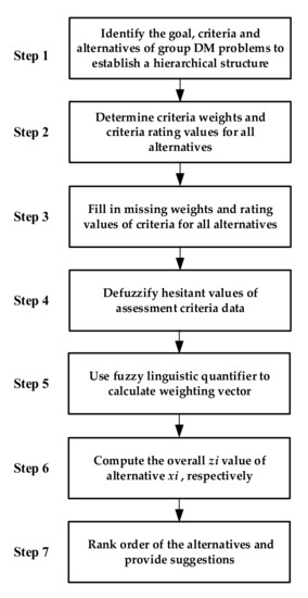 Group DM is about situations in which multiple individuals act collectively to achieve a solution in managerial practice. Because of the uncertainty and complexity of group DM problems, expert-provided information usually contains uncertain information. To effectively resolve this issue, Rodriguez et al. [17] introduced the hesitant fuzzy linguistic term set (HFLTS) to handle situations where experts are hesitating between several possible linguistic term sets for evaluating a variable, indicator, alternative, etc. The HFLTS method is a derivative of hesitant fuzzy sets [18]. Since it appeared, many researchers have developed applications and extensions of HFLTS in different fields. For example, Beg and Rashid [19] used HFLTS and applied the technique to order preference by similarity to ideal solution (TOPSIS) to solve an investment company selection problem and allow the company to invest money in the optimal selection. Based on HFLTS, Wang et al. [20] introduced an outranking method to survey issues of offensive warfare capabilities in information warfare. Offensive warfare capabilities include information suppression, hard destruction, network resistance, and psychological resistance. Montes et al. [21] applied HFLTS to propose a linguistic multi-expert MCDM model for housing markets. Ashtiani and Azgomi [22] considered the uncertainty, vagueness, and hesitancy of the provided opinions to propose a computational trust model based on HFLTS. Based on HFLTS, TOPSIS, and analytic hierarchy process methods, Onar et al. [23] introduced a new fuzzy quality function deployment method to effectively determine the best computer workstation. To date, HFLTS has received lots of attention and has been applied in many applications [24,25,26,27,28,29].
