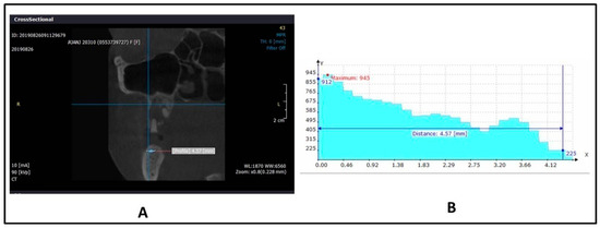 (A): Measurement of grayscale (GS) values using cone beam computed tomography (CBCT) technique in maxilla. (B): Graphical representation of corresponding GS value (HU).