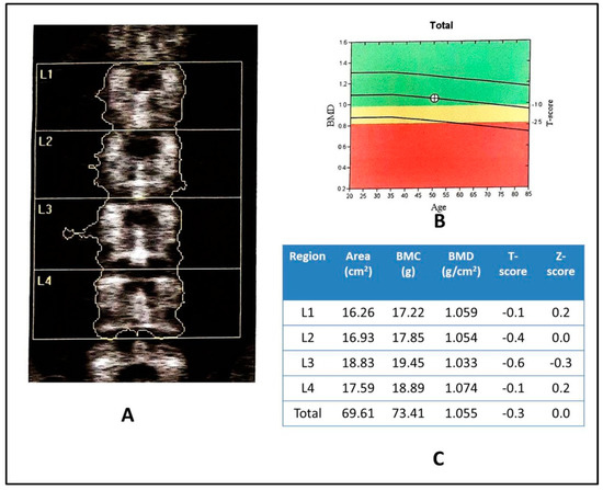 T scores obtained from dual X-ray absorptiometry (DXA) results. (A): Anatomical site L1, L2, L3 and L4, image characteristics k = 1.124, d0 = 40.3, 116 × 152. (B): T-score vs. White Male. Source BMDCS/Hologic White Male.Z-score vs. Source BMDCS/Hologic White Male. (C): Total jawbone mineral density (BMD) coefficient of variation (CV) 1.0%, autocorrelation function (ACF) = 1.039, bias correction factor (BCF) = 1.018, Total Hip (TH) = 10.313, Interpretation WHO Classification: Normal, Fracture Risk: Not increased.
