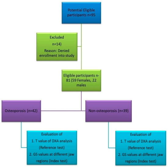 In total, 81 participants (59 females and 22 males) were recruited into this clinical inquiry. Participants’ ages ranged between 36 and 75 years (mean age ± SD: 57.9 ± 9.3 years). They were patients who were diagnosed with osteoporosis and were attending the dental implant clinic (College of Dentistry, Jouf University, KSA) for treatment with dental implant-supported prosthesis. The study was conducted throughout the period from March 2018 to March 2019.This clinical study was conducted according to the principles of the Helsinki Declaration (9th version, 2013). This research and the associated clinical procedures were ethically endorsed and approved by the Bioethics Committee, Jouf University, KSA (381-41). Before recruitment into this clinical study, each participant was requested to sign a written consent, after being provided with an explanation of this investigation and associated procedures. The study was conducted as per STARD guidelines [29].