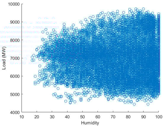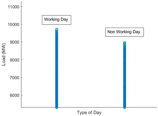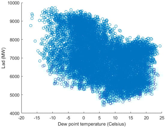 Figure 2 illustrates how energy load fluctuates in accordance with day type; as expected a significant increase in energy load for working days could be observed. Figure 3 represents temperature influence on load demand. A clear dependency of the load with respect to the temperature could be observed. Further interesting pattern-forming characteristics for the datasets are presented in Figure 4 and Figure 5, which illustrate the influences of humidity and dew point temperature on power consumption, respectively. These characteristics are studied in order to determine if a feature selection would benefit the algorithm and which of the predictors influence less the energy load data.