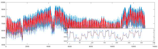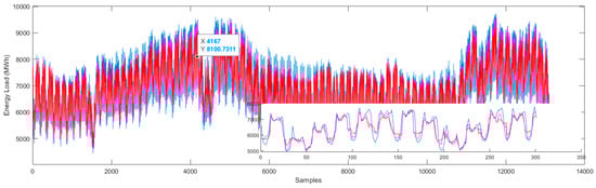 As proposed in the methodology section, to further improve the algorithm, the residuals were predicted using the same regression methodology. Applying this dual-layer prediction process improves the forecasting values and the performance metrics: MAPE = 4.09%, RMSE = 221.6 MWh, and MAE = 153.2 MWh. Figure 9 illustrates the load’s actual value in blue, the predicted value in red, and the dual-layer prediction in magenta.