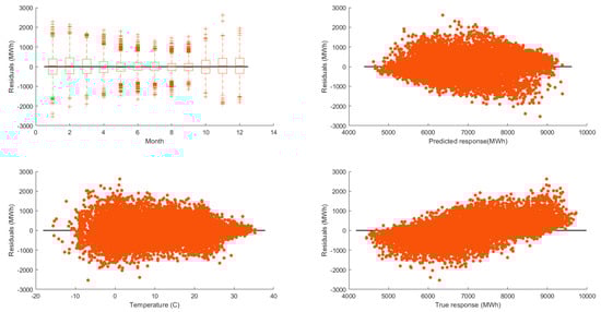 The graphical representations from Figure 8 present the residuals with true and predicted responses, and the influences of temperature and month. It can be observed how the month of the year influences the residual precision, with the lowest values for the middle of the year. The same patterns can be observed for the temperature predictor; in this case, the residuals are higher for lower values of the temperature.