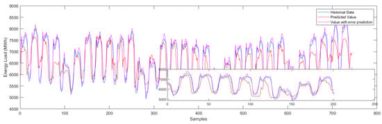 To further validate and test the algorithm’s fitness for the specific load pattern, another test was performed. As presented above, the algorithm was implemented on historic energy load data from January 2018 to June 2019. Data collected from the month of July were used to test the algorithm’s performance. Figure 10 presents a graphical representation of the measured and predicted energy load values for this specific period of time. This graph validates the algorithm that uses residual prediction and also shows its superiority over the hybrid method without error prediction.