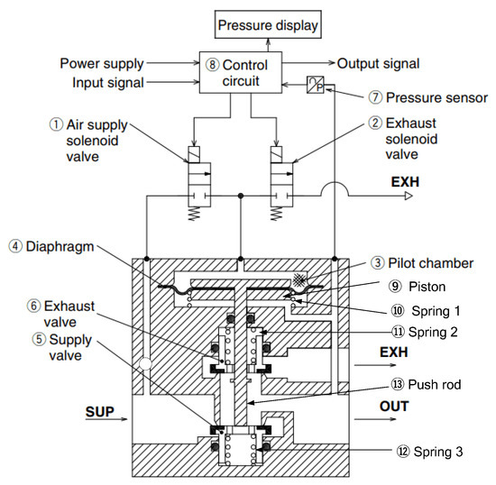Figure 2. When a control voltage is applied to the supply solenoid valve, the air supply solenoid valve opens, air in the supply port passes through the air supply solenoid valve and flows into the pilot chamber with the exhaust solenoid valve off. The pressurized air in the pilot chamber presses the diaphragm and piston, and the piston rod (spool) moves down. As a result, the air supply valve opens, and the compressed air flows from the supply port to the output port. When the input voltage to the supply solenoid is set to zero, the air supply valve closes, airflow stops, and output pressure remains unchanged after supply, and output flow is stabilized. After the exhaust solenoid valve is turned on, the exhaust valve opens, the compressed air in the pilot chamber releases to the atmosphere, leading to decrement of output pressure. The valve control circuit also measures output pressure via a pressure sensor to regulate the output pressure to be proportional to the reference voltage.