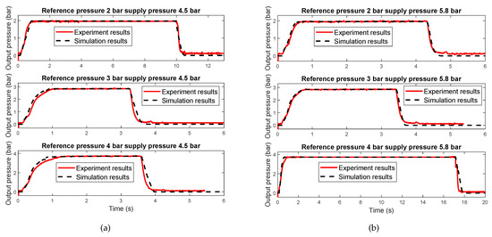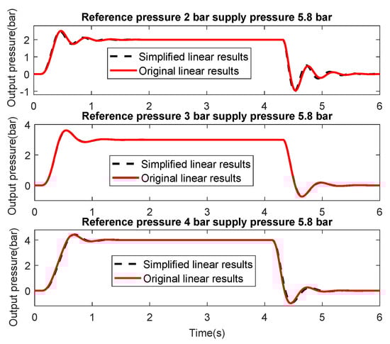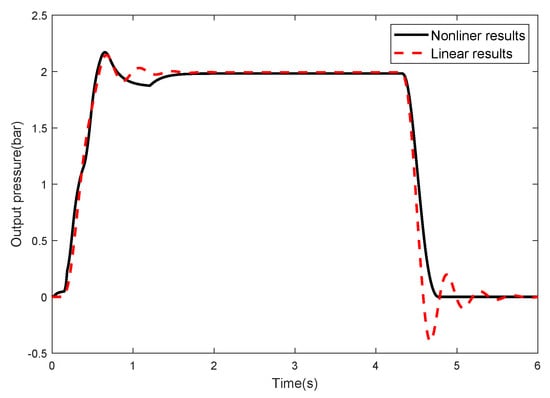 The discrete-time state-space model is transferred into the continuous-time one and then into a continuous-time transfer function for the air brake system with 5.8 bar supply pressure and 2 bar reference pressure; see Equation (