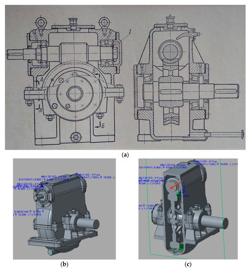 In order to improve what abovementioned process, a reducer of globoid type was considered in this work; in this kind of reducer, a worm screw is coupled with a wheel with straight teeth. This mechanism is generally used in the transmission of motions for generally orthogonal axes, but in any case, they are always skewed, with a low transmission ratio between 1/5 and 1/200. The gearbox taken into consideration, as the case study of the present paper, is depicted, initially, in the 2D drawing (Figure 1a). It is a reducer with a warm screw, usually employed to transmit the motion between two perpendicular asses.
