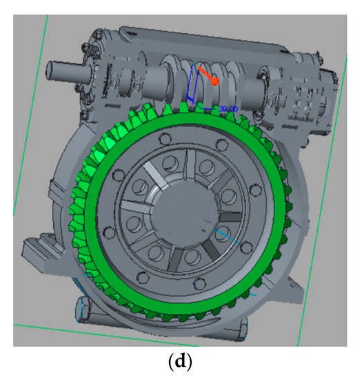 (a) 2D drawing of the gearbox with warm screw (staring point of the process). (b) Entire assembly. (c) Transversal section. (d) Longitudinal section. (b–d) Screw-helical wheel pair; 2D drawings taken from Straneo Consorti et al. [11] and 3D modeled.